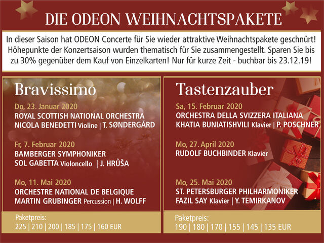 Bestellen Sie Konzertkarten, Weihnachtspakete oder auch Geschenkgutscheine www.odeon-concerte.de | Tel. (0941) 29 60 00